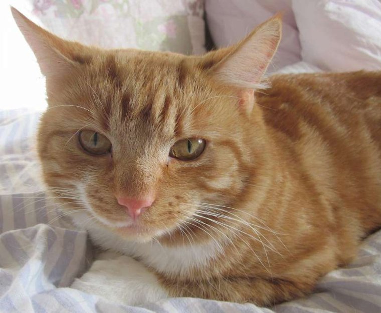 Tobias er en slank og fin pus. Skipskatt, dvs ekstra tær på alle labbene. Rødtigret med litt hvitt under brystet, på labbene og i ansiktet. Korthåret og kastrert. ID-merket i høyre øre med "S," og med chip. Relativt usikker, men aksepterer kos.