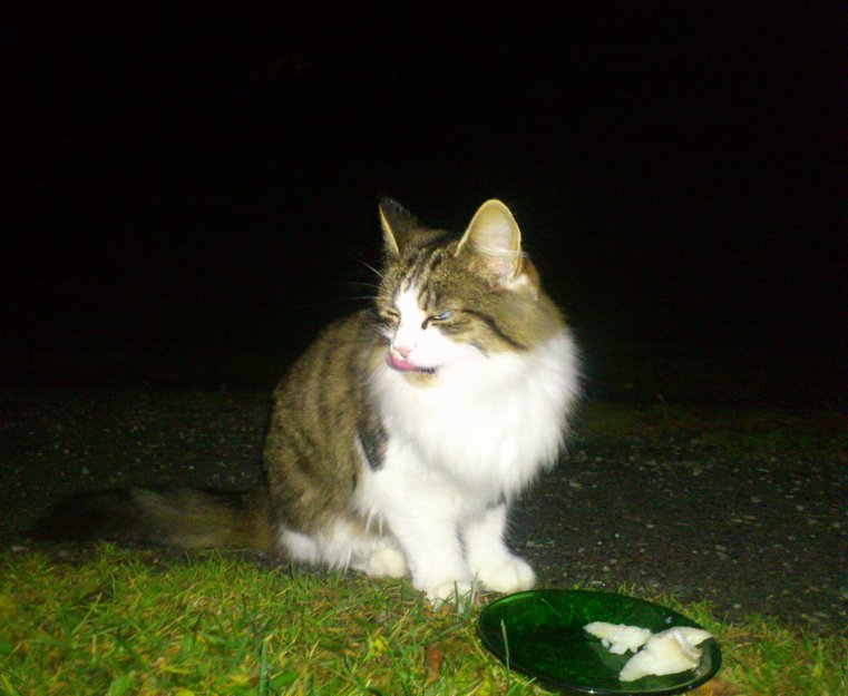 Brun/svart på hodet, ryggen og bustete langhåret hale. Hvit neserygg, og nedre del av ansiktet. Brun flekk ved nesa. Hvitt bryst, mage og bein. Så ut som skipskatt (en tå for mye). Hårtuster i ørene. Klarte ikke se helt sikkert på grunn av mye pels, men trolig hunkatt.