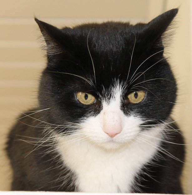 Svart ikke så stor katt, med hvitt i ansiktet, under magen og labber. Den er veldig snill og litt reservert.