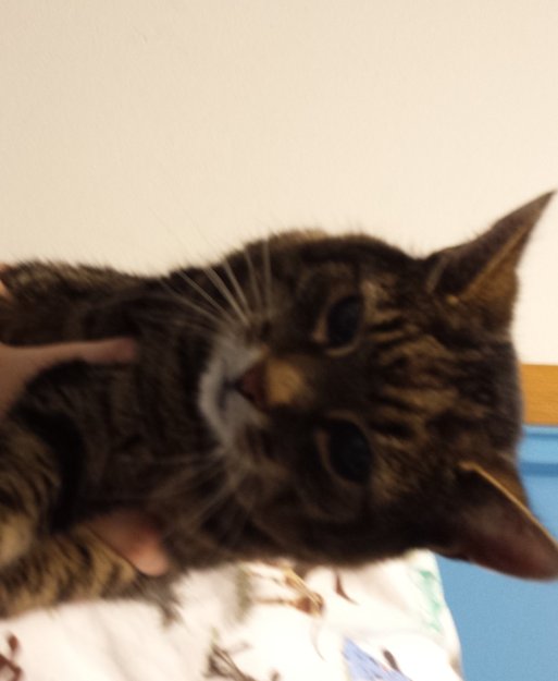 Jeg ringte Spydeberg Smådyrklinikk og katten ble bragt dit. Veterinæren kunne bekrefte at han var blind eller hadde kraftig nedsatt syn, pupillene stod vidåpne hele tiden. Katten er i følge vetrinær kastrert, men har ingen chip eller annen id-merking. Prognosene for katten ser desverre dårlige ut, men jeg ville med dette forsøke å finne eierne.