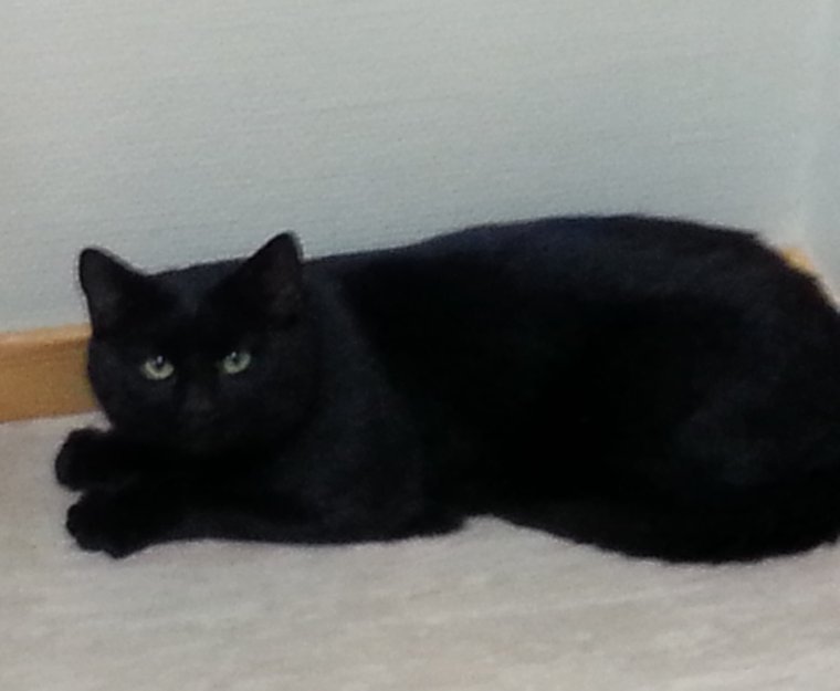 Helsvart, ukastrert hannkatt med store runde øyne og ganske bredt fjes, har oppholdt seg i nærområdet Kurland i flere måneder. Tillitsfull.