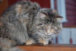Grå og svart katt med noen brun/orange flekker. Den er liten og veldig kosen. Litt sky til nye mennesker.