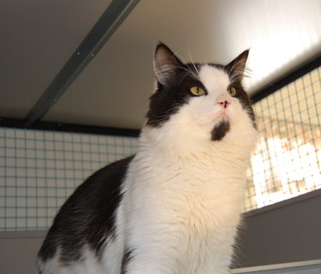 Vakker, snill og kontaktsøkende hannkatt. Ganske stor. Sort og hvit pels, rosa og sort snute. Spesielt ansikt, sort på haka.