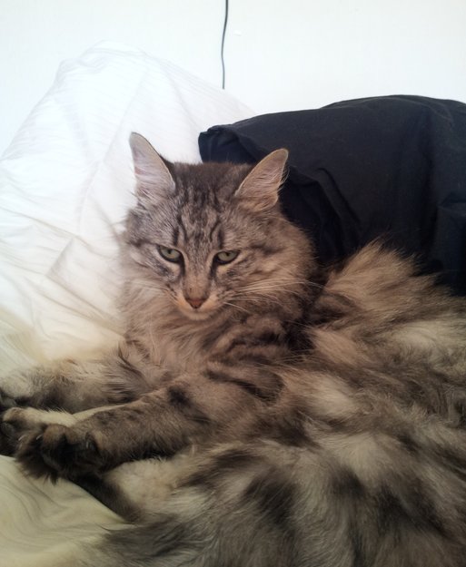 Vakker liten katt dukket opp hos oss. Streifa litt rundt huset en liten stund før den kom inn. Veldig sulten og litt flokete i pelsen. Dukket opp i september. Litt usikker på kjønn. Mulig kastrert hannkatt. Har godtatt barn og hunder vi har veldig godt. Veldig kjælen.