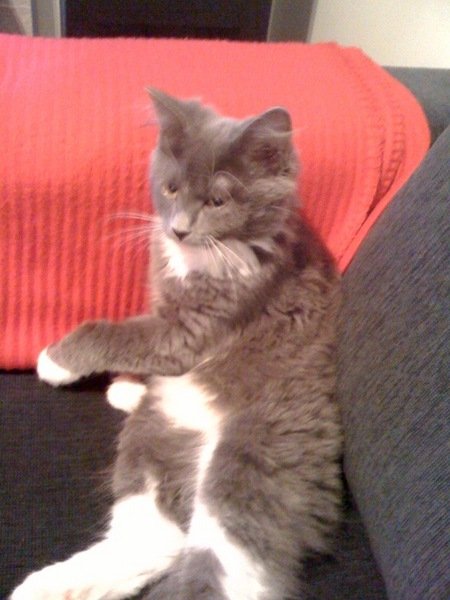 En fin gråhåret herremann med hvite poter. Han er 7-8 måneder gammel.Kort pels, spiss snute som kan minne noe om en rev.En liten hvit flekk(ikke veldig synlig) i panna.