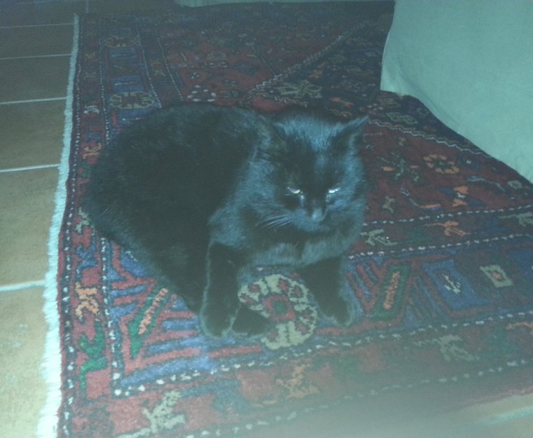 Vi fornyet etterlysningene over hele nettet, på mange forskjellige sider i kveld, og etter en halvtimes tid ringte telefonen fra Vettre Hotell som ligger ca. en km unna, de hadde hatt ham rundt der i flere uker. Nå var han der hele tiden og ville også inn, så de titta på nettet og så ham. Helt fantastisk, etter syv uker ligger han her i sofaen og ser ut som han har klart seg utmerket, litt lurvete i pelsen og veldig sliten, men ellers helt i orden. Vi er helt fra oss av glede og takknemlighet, og han ser ut som han er lettet pusekatten også! Ikke gi opp dere andre heller, miraklenes tid er ikke forbi! :-) <3