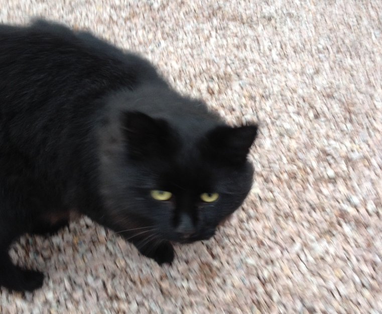 Kosete svart katt med litt hvitt foran på brystet. Litt ekstra pels på ørene og litt svakt krøllete under megen. To av tennene er synlig " utenfor "munnen.