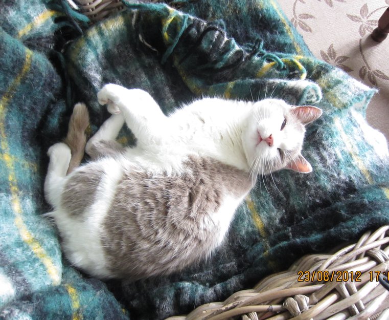 Mest hvit med grå tegninger. Hvite labber, hvit i ansiktet med litt grått i panna. Veldig glad i mennesker, svarer når du snakker til ham. Lyder navnet Franz.