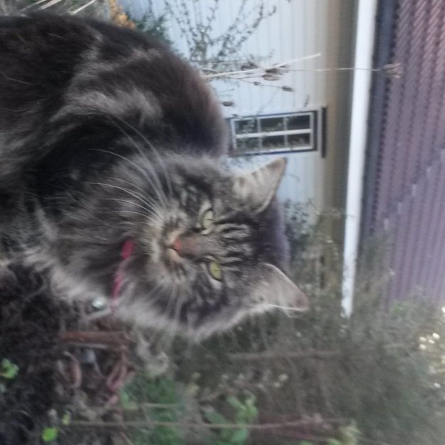 Svart med grålige striper. Rosa halsbånd.