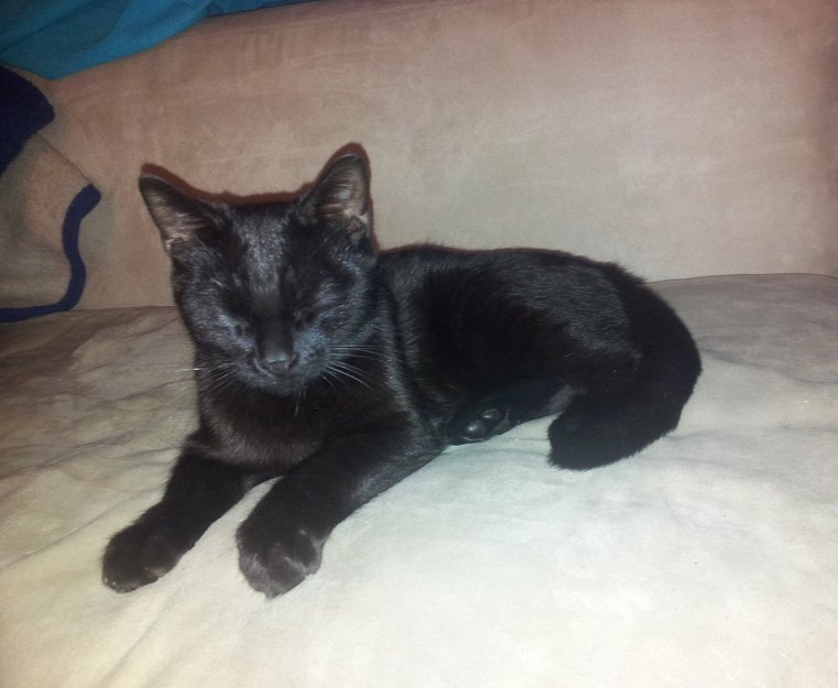 Svart katt, virker relativt ung, ca 1/2 år + kanskje. Fin blank pels og veldig kosen.