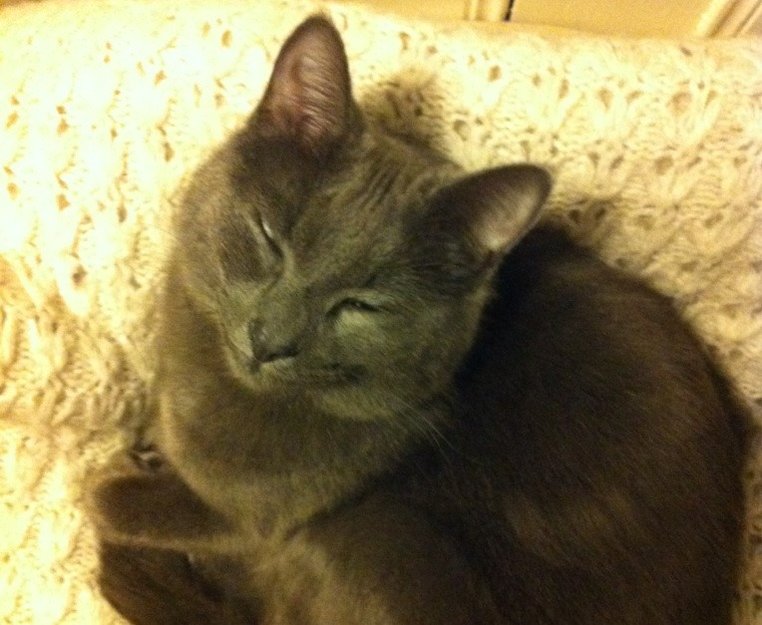 Han er 2,5 år, har mørkegrå pels og gule øyne. Han er liten i vekst til å være hannkatt og har chip i nakken.