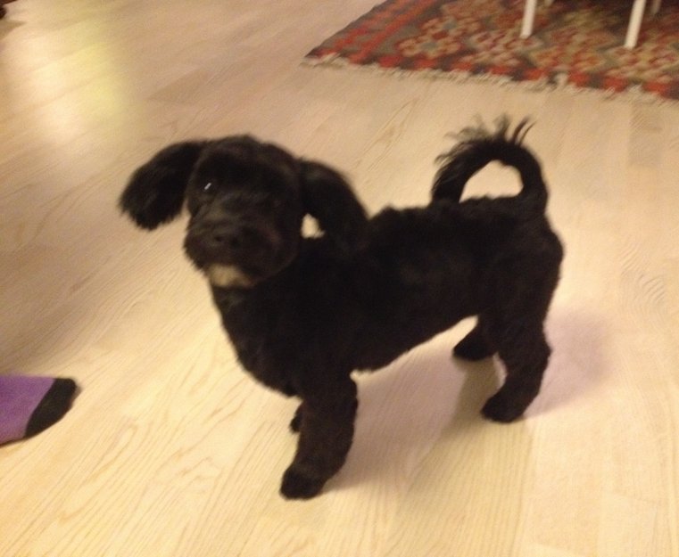 Hunden er sort med en hvit flekk på brystet. Han veier ca 5 kg.