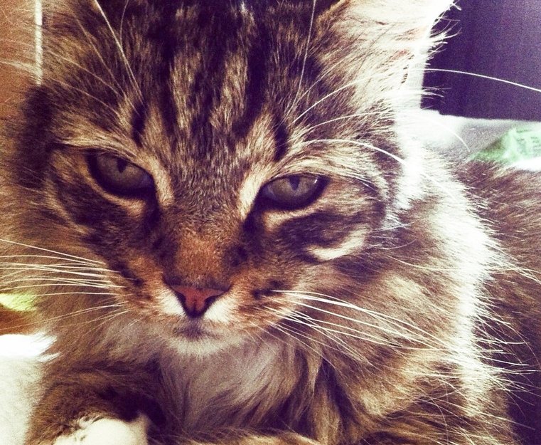 Simba er en kjempe flott katt med spraglete farger. Han er tynn med lang pels.