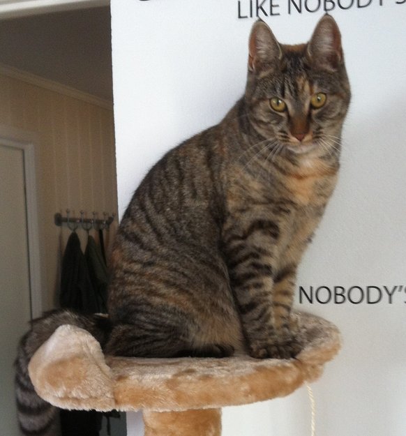 Stor hunnkatt, snart 2 år, chip. Brun/beige spraglete. Veldig kosete og "prater" mye!