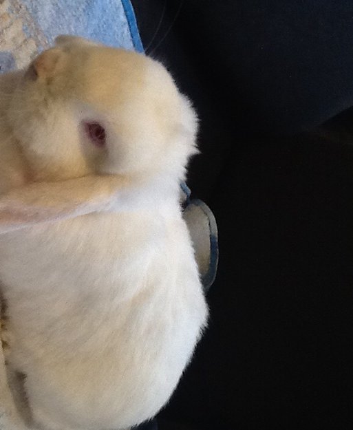 Har røde øyner og hengeører.kjønn ukjent,men tror det er en hunn kanin.