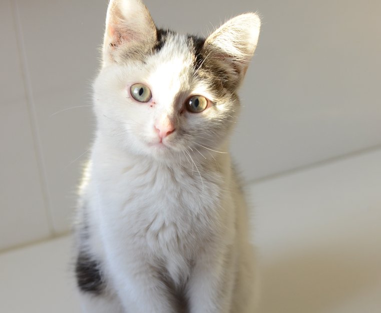 Mest hvitt, med grå/svart tigret hale, rygg og bakhodet over ørene. Veldig søt og snill pus.
