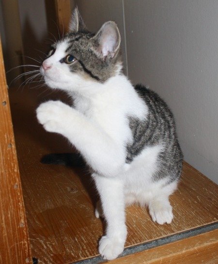 Kosen og tillitsfull kattunge, korthåret hvit med tigrete flekker. Rosa snute.