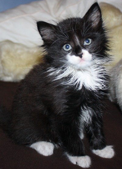 Liten svart og hvit kattunge. Kosete og snill, men både sliten og feilernert da vi hentet han.