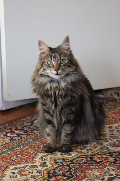 grønne øyne, litt hvit på halsen, lang pels - veldig sky