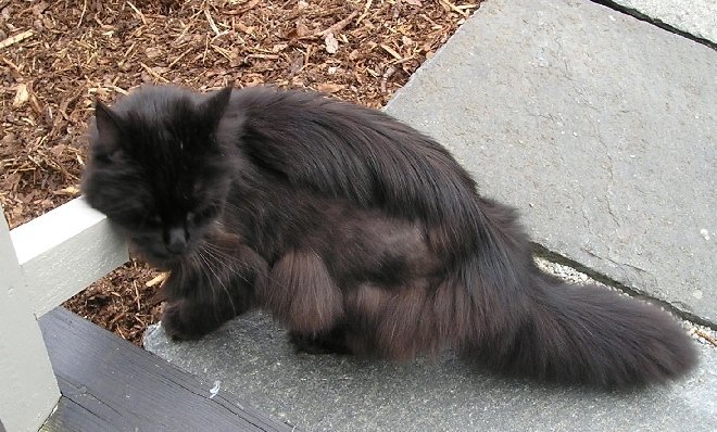 Han har vært barbert på hver side og under hakepartiet og har derfor kortere pels der enn under magen, på ryggen og halen. Han er 100 % svart i farge.