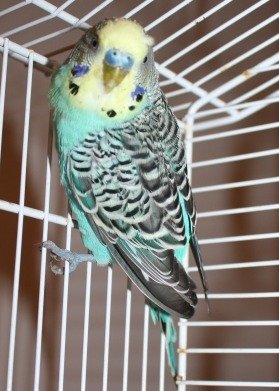 Turkis bryst, gult hode, snill og trivelig. Er noe stresset og sliten etter en tur ut i det gode været.