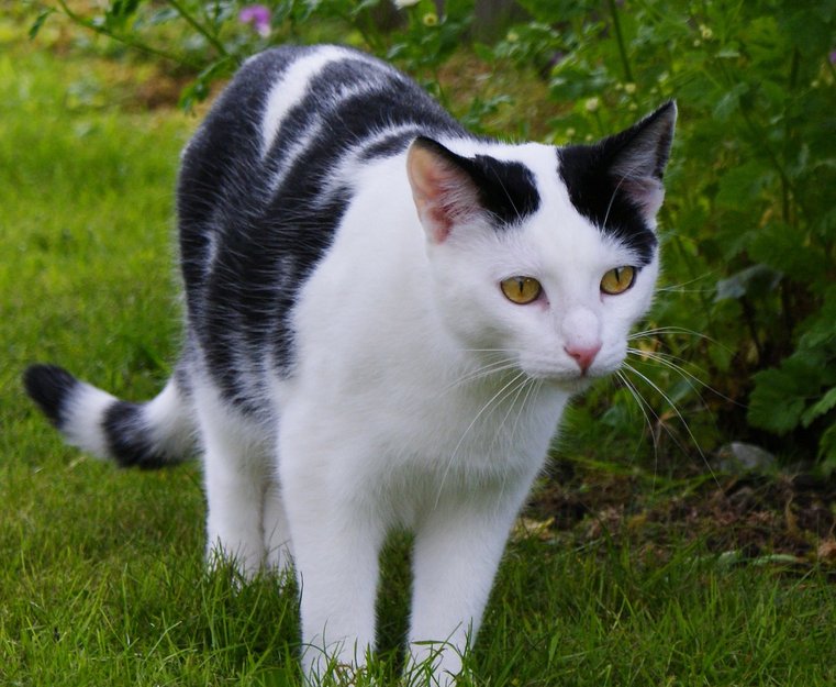 Voksen, sterilisert hunnkatt. Svart haletipp. Snill, men litt sky.