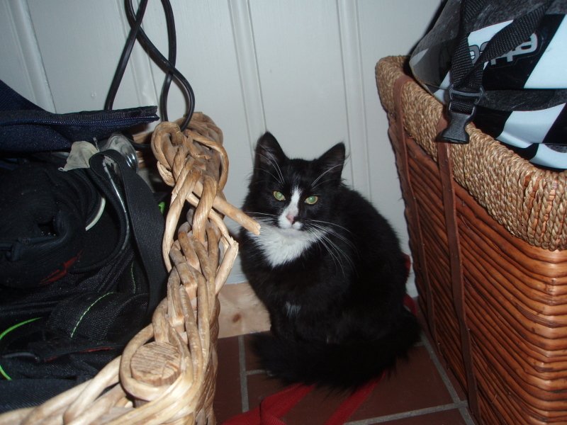 Liten ung hannkatt, sort og hvit, han har en hvit stripe nedover nesen, hvite sokker og hvitt bryst. Han er også hvit mellom frambeina. Husvant og vant til kasse. Litt tynn.