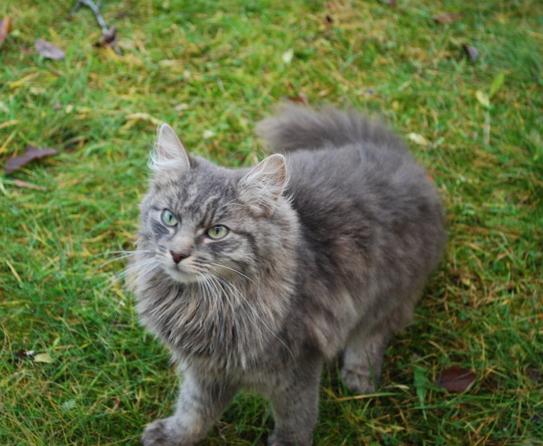 Liten langhåret, grå katt har oppholdt seg rundt vårt hus siden fredag. Jeg har ikke greie på katter, men den ser ut til å være en ungkatt/kattunge, se bilde.