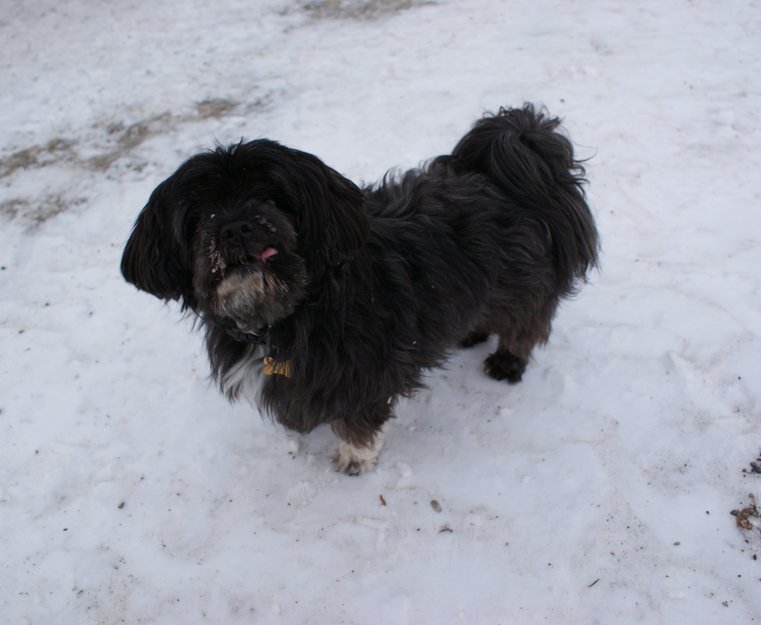 Liten hund. Sort med hvitt på brystet og en hvit fremfot.