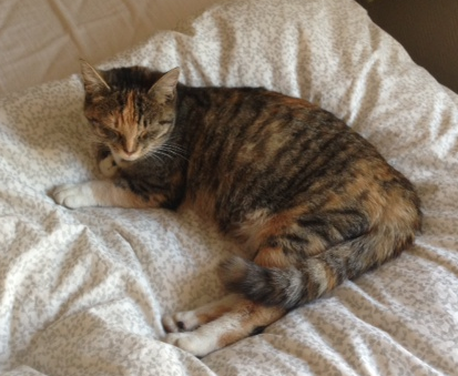 Hun har hvite poter, hvit mage, og ellers flerfarget, orange, sort, grå og brun.