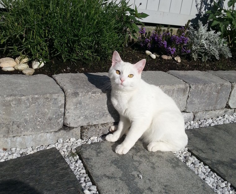 Liten hvit hunkatt, med en liten svart flekk bak på nakken. Grønne øyne. Omtrent 1,5 år gammel.