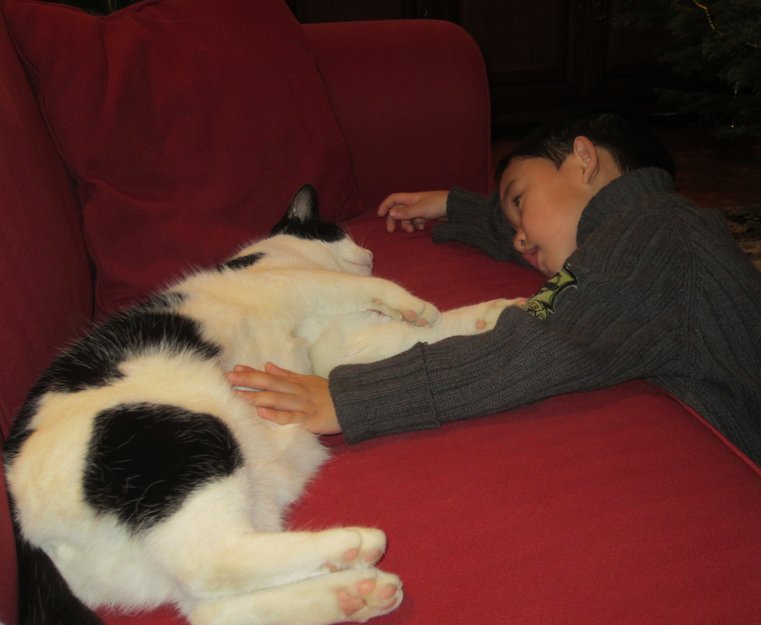 Tobias har sorte flekker og ellers hvit. Han er en stor hannkatt. Snill og litt sky.