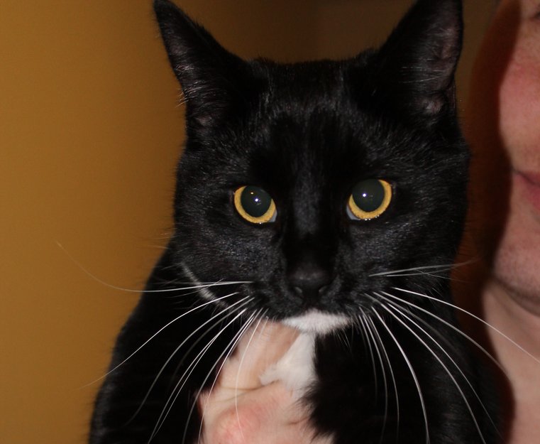 Langhåret. Svart med hvite poter. Hvit på brystet og under haken. Gul grønne øyne. Hadde ingen form for merking.
