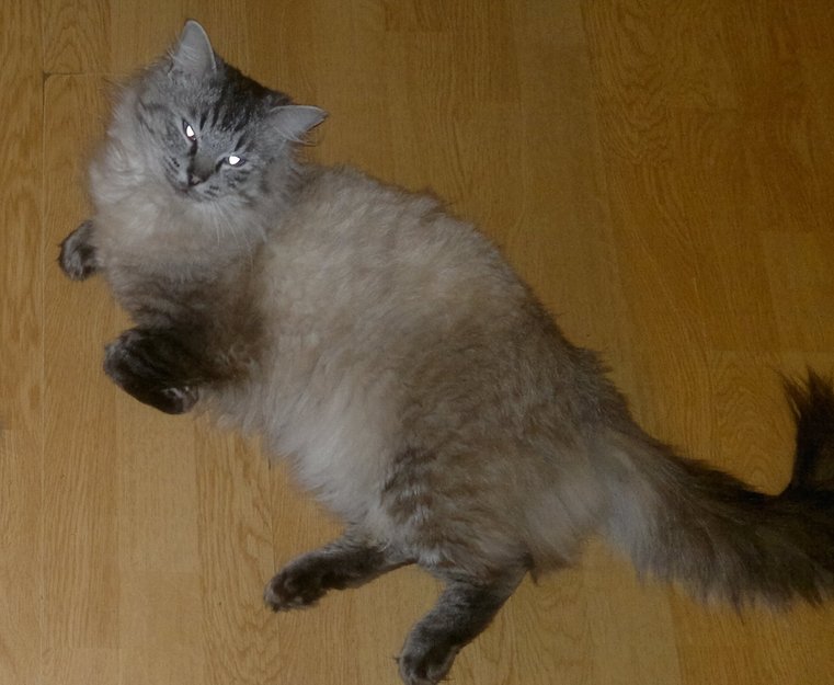 Langhåret grå med mørke føtter og hale, Fine blå øyne