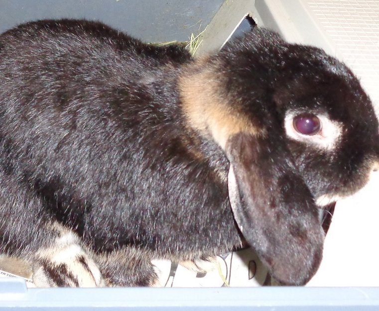 Ganske stor, svart dvergvedderkanin med hvit hale, mage, og hvite flekker rundt øynene. Hun har en brun flekk på nakken fra øre til øre.