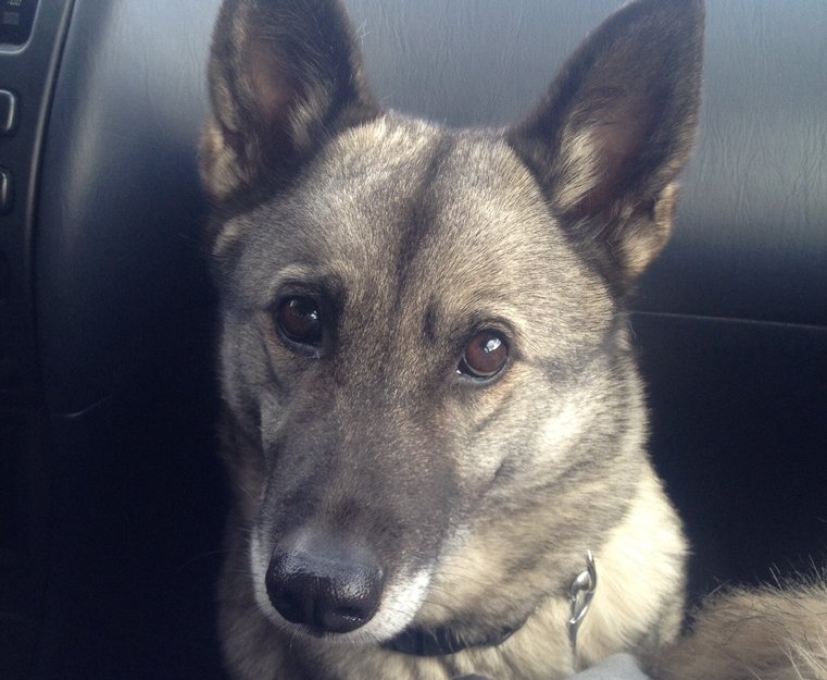 Norsk grå elghund, krøllet hale. Grå og svart.