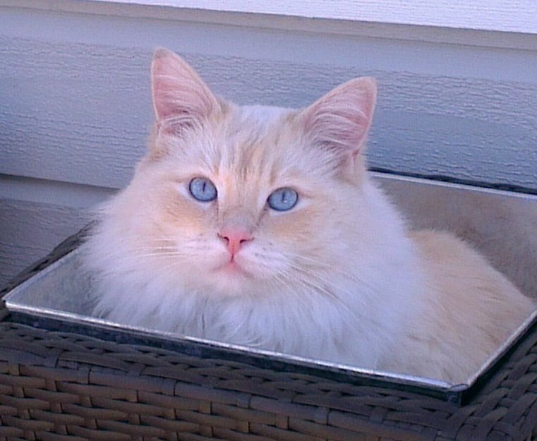 Mellomstor katt (ca. 7 kg). Blå øyne og hvit pels (litt rødskjær i pelsen, men mest hvit)