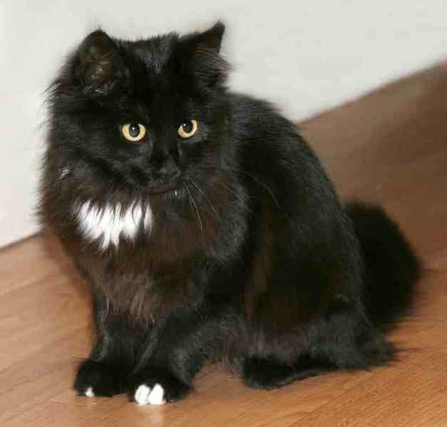 Semilanghåret, svart med hvit flekk i brystet, litt hvitt mellom bakbeina og hvit ytterst på potene på frambeina