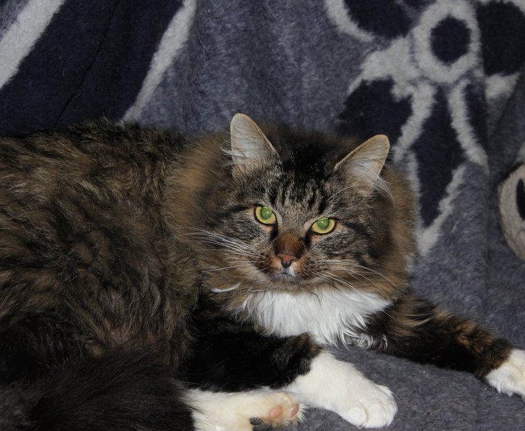 Den har holdt til på en gård i lang tid, revet hull i søplesekker på jakt etter mat. Framsto som meget sky. Ble tatt inn av Dyrebeskyttelsen. Viser seg å være en veldig menneskekjær katt som må ha en eier et sted.