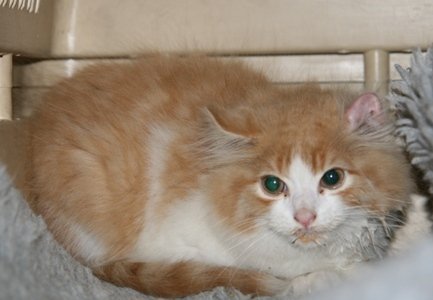 Rød og hvit liten kattunge. Ene øret har en gammel bittskade.