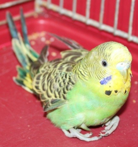 Grønn og glu undulat. Ganske ung. Litt deformerte fjær og foter.