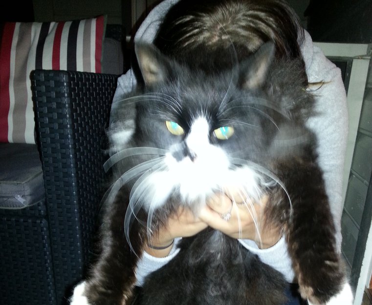 Veldig kosete katt. Hvitt i ansikt og poter.