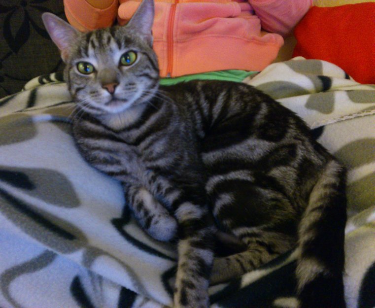 Slank og lang, svart på undersiden av potene, grønne øyne