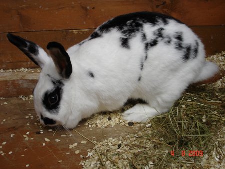 Snill og koselig hunn-kanin, hvit med sorte flekker/prikker.Sorte tegninger rundt øynene.