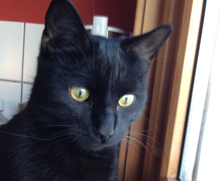 Liten, sannsynligvis en ungkatt. Ensfarget, glinsende svart pels. Veldig snill og tillitsfull. Husren, er vant med kattetoalett.