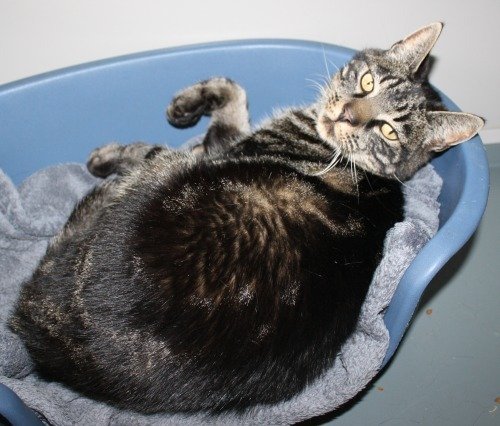 Korthåret kosete og snill katt, tigret, med mye sort. Han er øremerket, men tallene er svært utydelige og desverre uleselige.