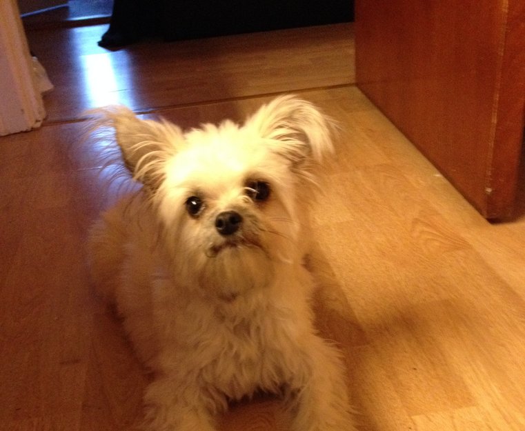 Hvit/offwhite rufsete pels. Ser ut som en hvit yorkshierterrier.