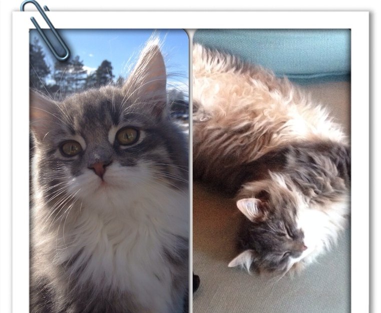 Lucy har masse lang pels og er skikkelig fluffy. Hun er gråspraglete, hvit på magen og nede på potene. Veldig kjælen, men litt sky for fremmede.