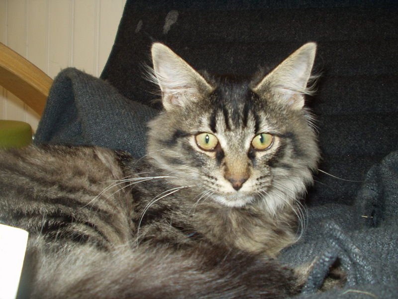 Veldig kosete og sosial skogkatt. Halen står rett opp og ligger litt bakover på ryggen. Langhåret.