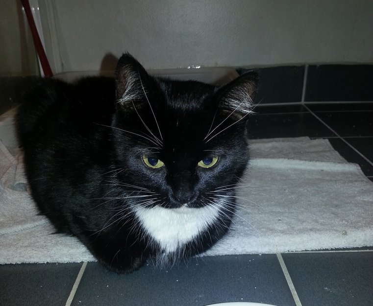 En sort og hvit liten dame pus som har godt ute en stund. Ble fanget inn av Dyrebeskyttelsen Norge Nord-Jæren i lag med to små unger på 5-6 uker.